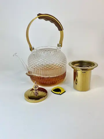 ✨ قوری پیرکس برفی دسته طلایی 1000 میل – زیبایی چای‌ساز شما در یک نگاه