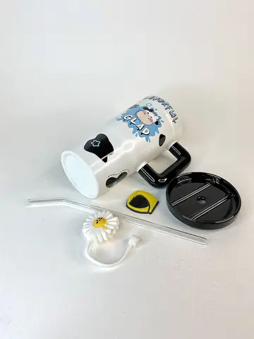نوشیدن از یک ماگ بلند، حس متفاوتی از حجم و عمق نوشیدنی ایجاد میکند. این مدل با قطر 9 سانتیمتر و ارتفاع 18 سانتیمتر، تعادل خوبی بین ظرفیت و خوشدستی برقرار کرده است. لبه صاف و پرداختشده، تماس لب را راحت میکند و نی پیرکس، امکان نوشیدن بدون تماس مستقیم را فراهم میآورد. سرامیک باکیفیت، دمای نوشیدنی را متعادل نگه میدارد؛ یعنی چای گرم، مدت بیشتری گرم میماند و نوشیدنی سرد، دیرتر دمای محیط را میگیرد. همین ویژگی، آن را برای مصرف روزانه در محل کار، خانه یا حتی زمان مطالعه ایدهآل میسازد. طرح گاو با خطوط نرم و رنگهای ملایم اجرا شده تا حس لطافت و صمیمیت ایجاد کند. حضور گل آفتابگردون روی نی، یک جزئیات شاد بصری است که حتی وقتی ماگ روی میز قرار دارد، توجه را جلب میکند.